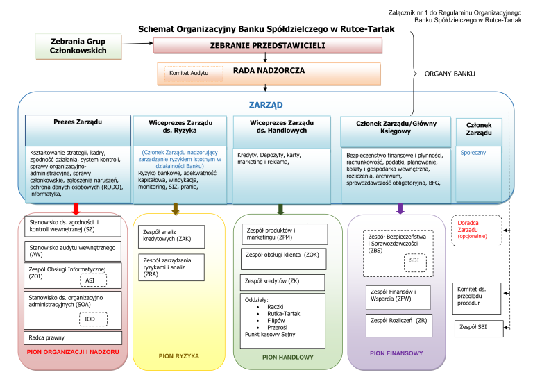 Zorganizowanymi częściami składowymi Banku jako organizacji są jednostki i komórki organizacyjne. Jednostkami organizacyjnymi Banku są Centrala w Suwałkach oraz cztery Oddziały (Rutka-Tartak, Raczki, Filipów oraz Przerośl), komórkami organizacyjnymi zaś zespoły, stanowiska pracy oraz Punkt Kasowy w Sejnach. Centrala realizuje kluczowe dla całości Banku zadania merytoryczne i organizacyjne oraz nadzoruje ich wykonanie w stosunku do pozostałych jednostek organizacyjnych Banku. Komórkami za to odpowiedzialnymi są Zespoły: bezpieczeństwa i sprawozdawczości, finansów i wsparcia, rozliczeń, obsługi informatycznej, analiz kredytowych, zarządzania ryzykami i analiz. Centrala prowadzi również działalność handlową, tak jak pozostałe jednostki organizacyjne. W centrali za tą działalność odpowiadają: Zespół obsługi klienta oraz Zespół kredytów. Poszczególnymi Oddziałami, Zespołami oraz Punktem Kasowym, kierują wyznaczeni Kierownicy.